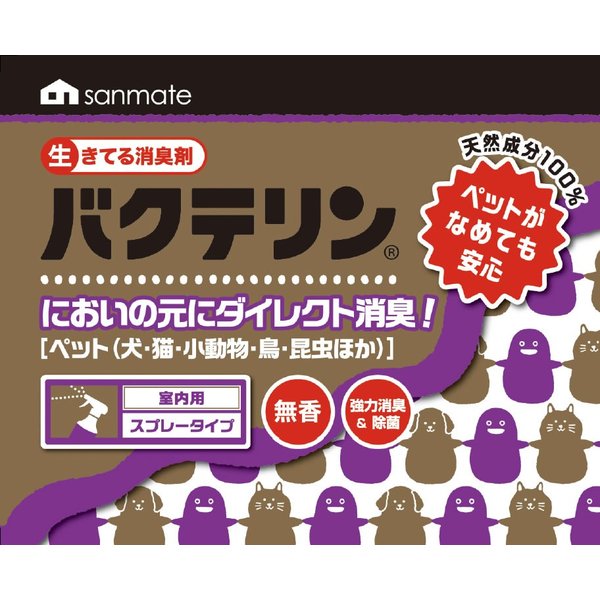 〜〜 使い方いろいろ 〜〜 ○犬用トイレのお掃除にシュッ! ○猫用システムトイレのマットにシュ! ○ペットの飲み水に適量を加えると便臭が軽減! ○トイレのウンチやおしっこに直接!残った猫砂にも! ○ペットの体に直接かけてブラッシング ○ペットとお出かけした後の車内の清掃に! ○鳥カゴや水槽の消臭や浄化にも! 犬用・猫用・小動物用の消臭剤として開発しましたが、バクテリンの善玉菌は 有機性のニオイ全てにしっかり作用します! ⇒キッチンの生ごみの悪臭も強力消臭! ⇒靴やサンダルについた臭いも強力消臭・除菌!(※1)