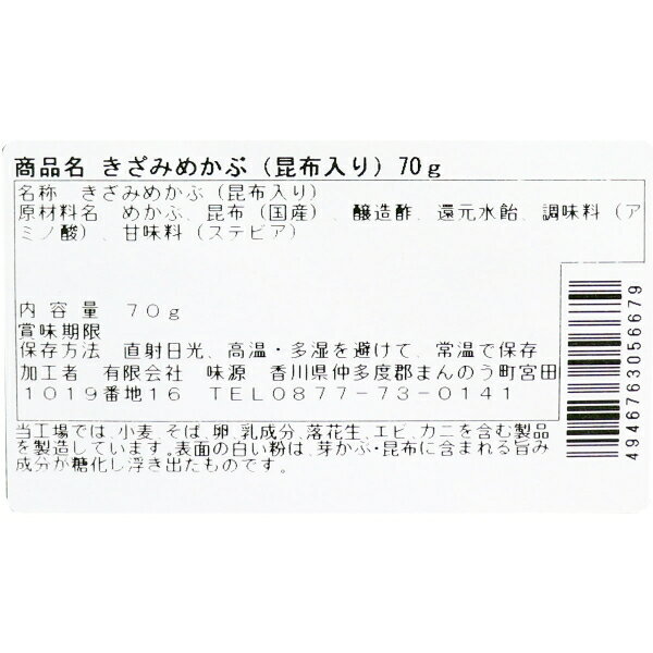 有限会社味源個装サイズ:180X300X20mm個装重量:約100g内容量:70gケースサイズ:30X17.5X49cm原産国:韓国【発売元:味源】【名称】きざみめかぶ(昆布入り)【原材料】めかぶ、昆布(国産)、醸造酢、還元水飴、調味料(アミノ酸)、甘味料(ステビア)【保存方法】直射日光、高温・多湿を避けて、常温で保存してください。