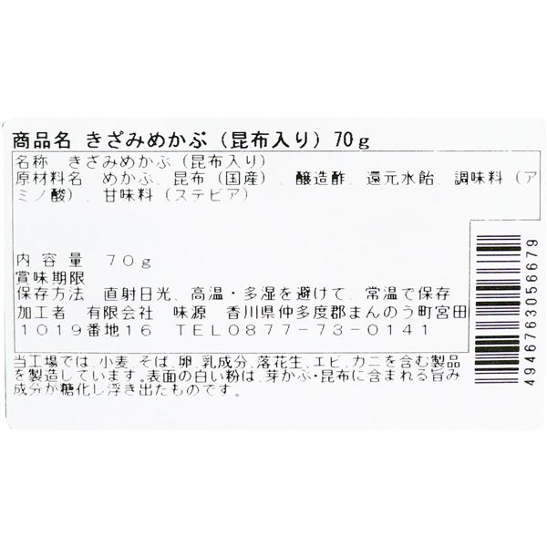 【名称】きざみめかぶ(昆布入り)【原材料】めかぶ、昆布(国産)、醸造酢、還元水飴、調味料(アミノ酸)、甘味料(ステビア)【保存方法】直射日光、高温・多湿を避けて、常温で保存してください。